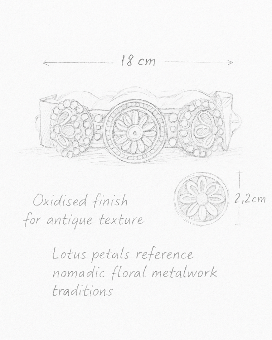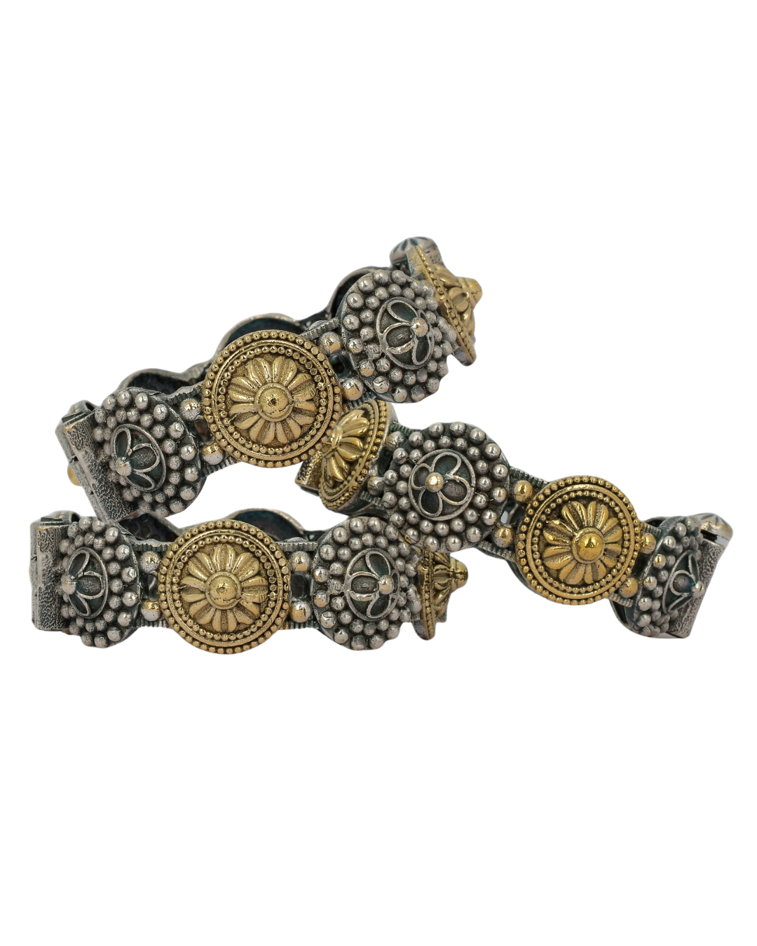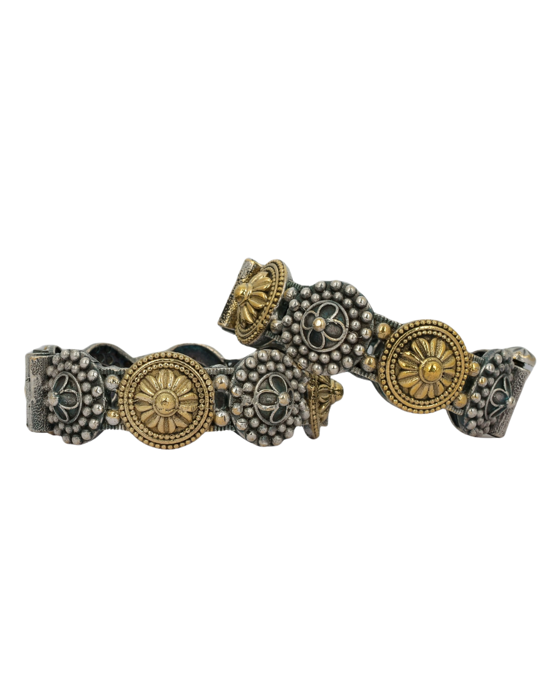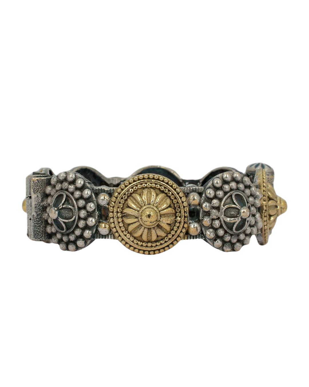 Handcrafted with precision, this two-tone oxidised silver and gold cuff is adorned with intricate detailing and antique accents, seamlessly blending contrasting metals. Perfect for layering with a watch, wearing solo, or stacking together with our other cuff bangles.