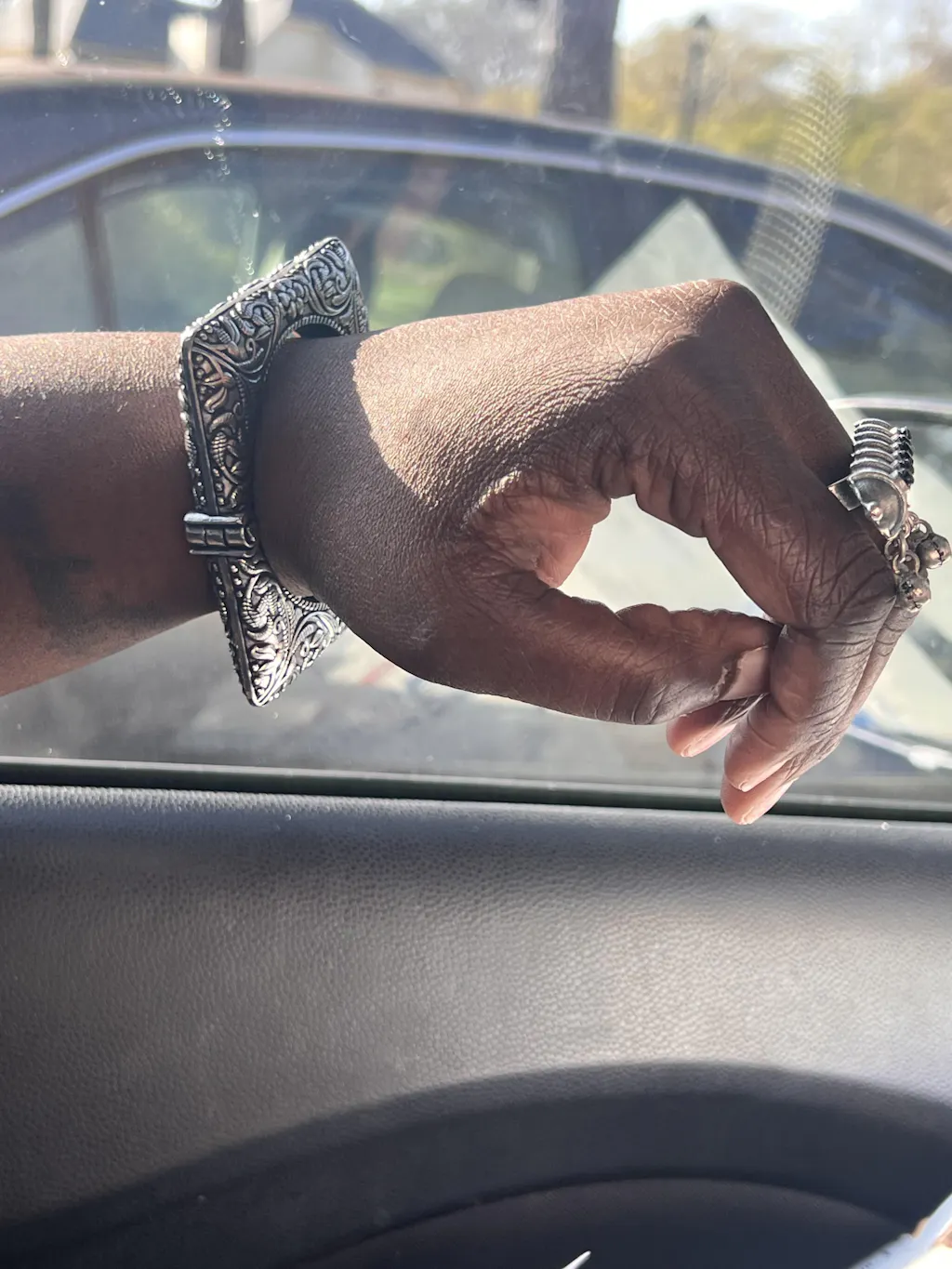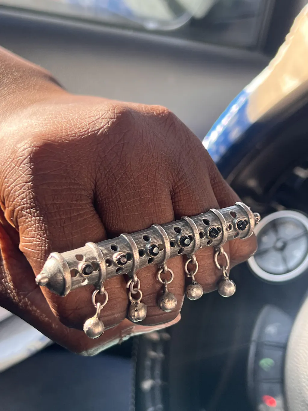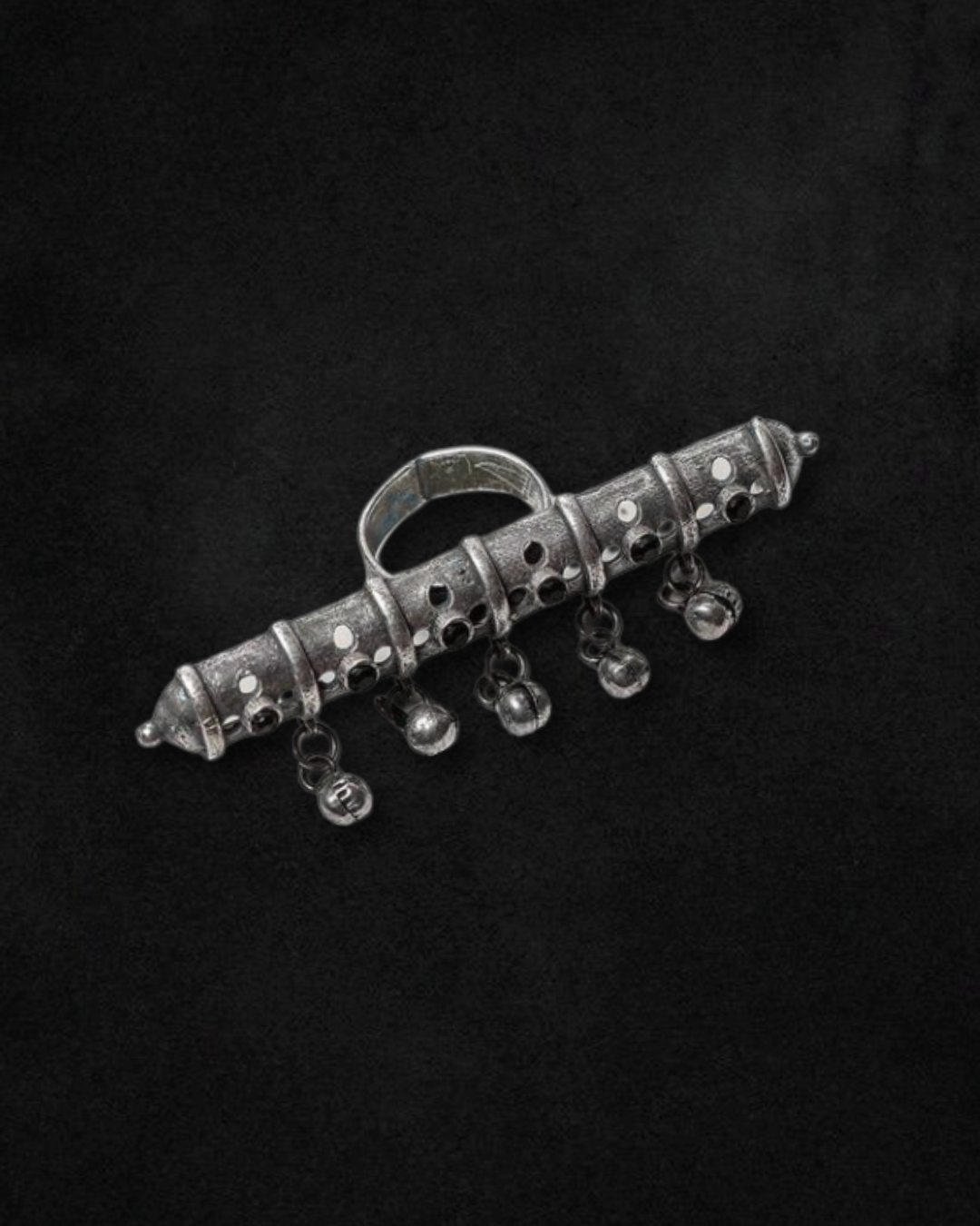 Handcrafted in oxidised silver, its sculptural design balances heritage energy with modern refinement. Wear it with the bells facing downward toward the arm, allowing their movement to add rhythm and intention to every gesture. She is not subtle. She is a statement.