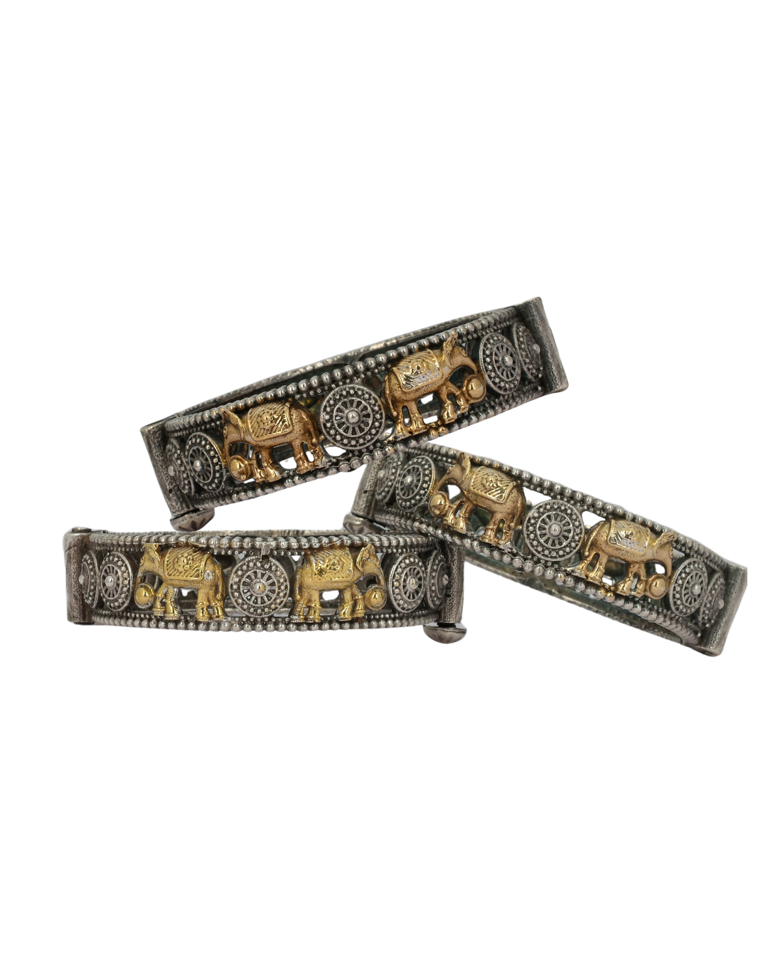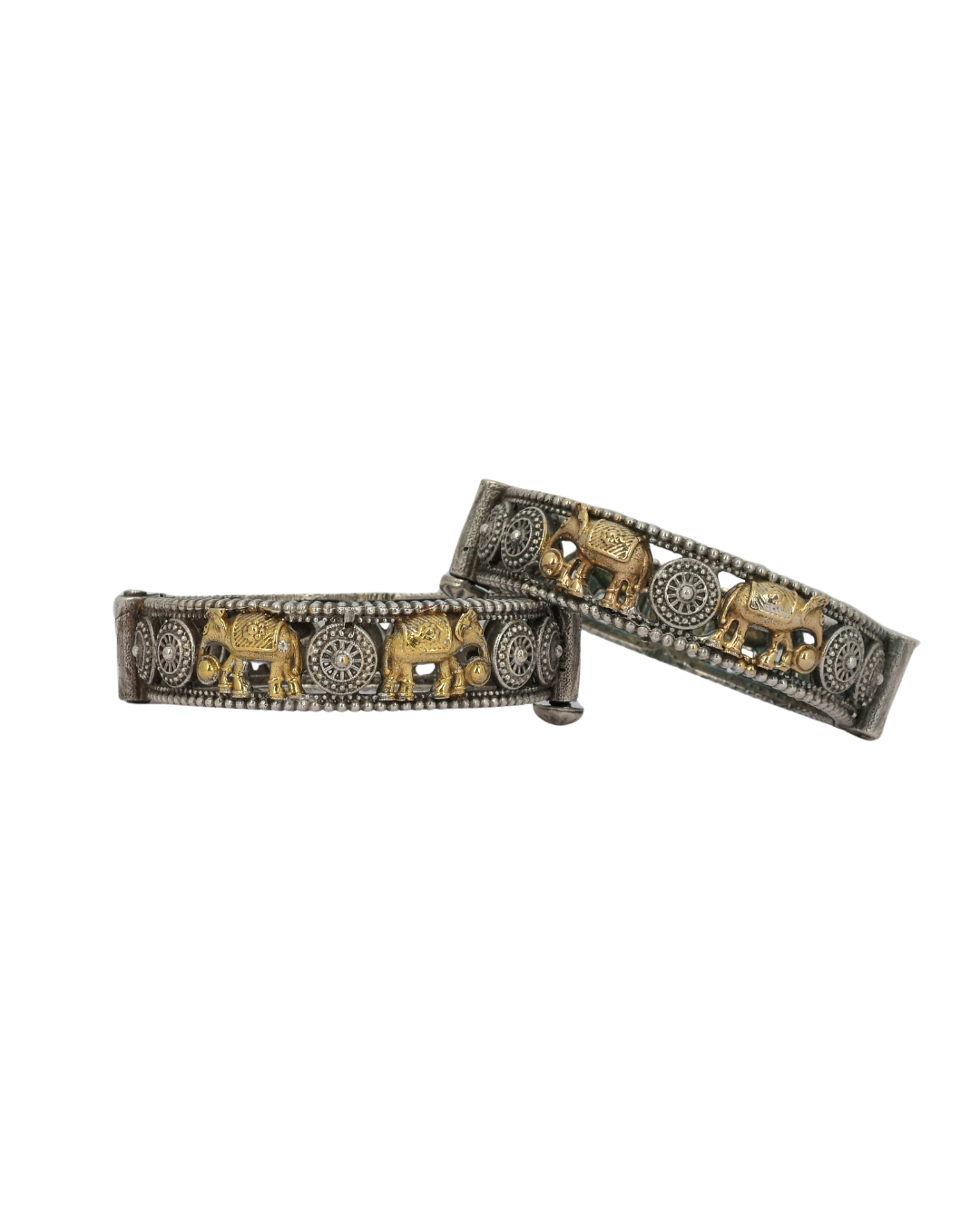 Handcrafted using traditional techniques, this cuff bangle is adorned with raised baby elephant motifs and circular engraved medallions inspired by archival Indian ornamentation. The contrast of oxidised silver and antique gold brings depth and dimension to the design, balancing symbolic storytelling with bold, sculptural form.